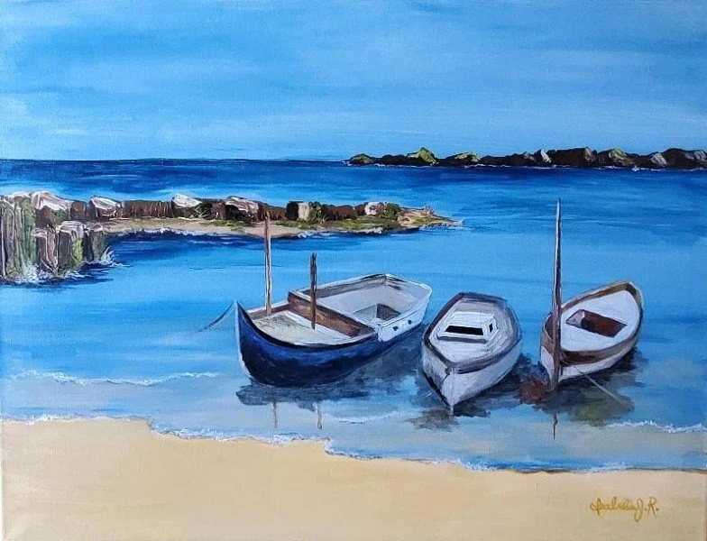 Inspired by a figment of Isabelle’s imagination “Three Boats” is a classic scenic painting that calms the senses. Acrylic on canvas 18 × 24 inches
