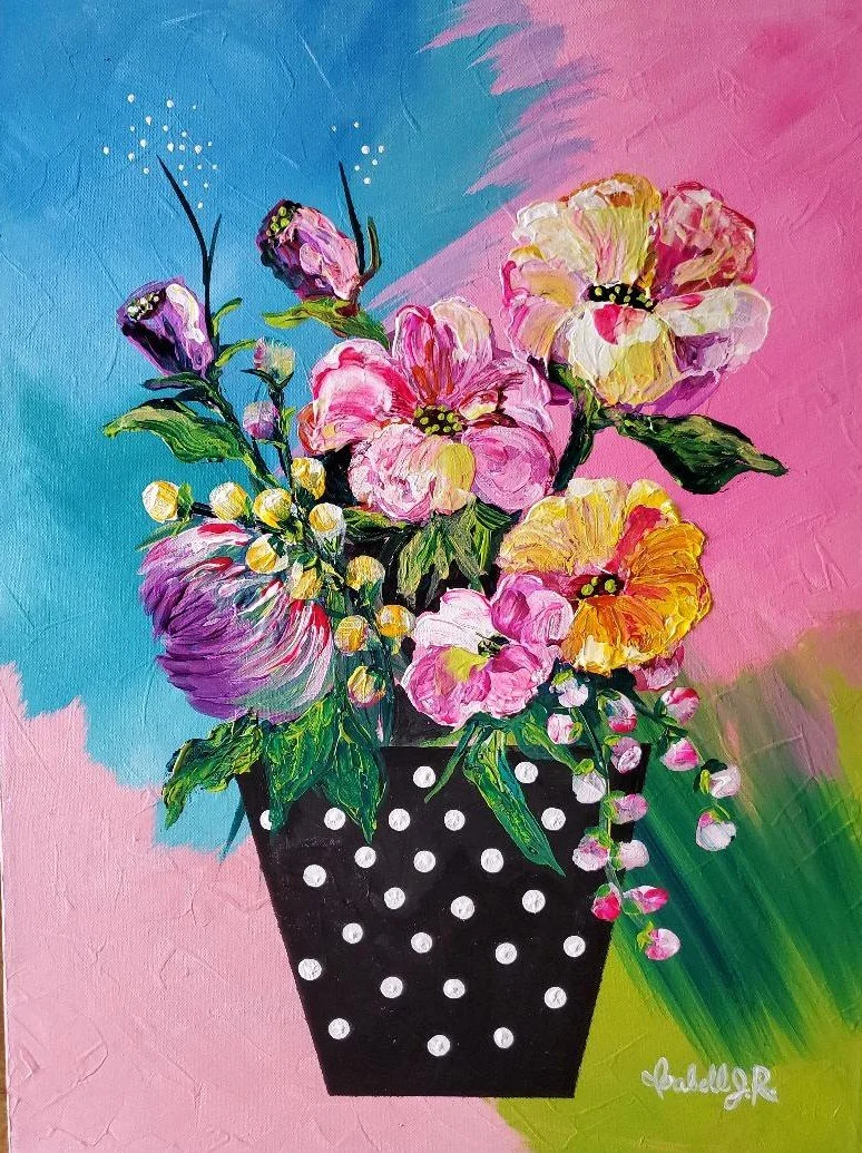“Flowers and Dots” is a Palet Knife painting.